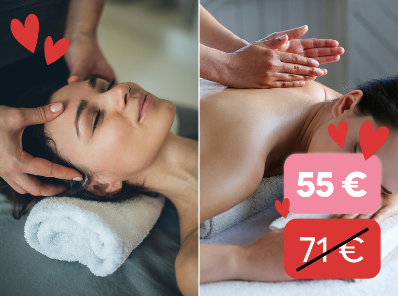 Profitez en amoureux ou offrez la prestation « MASSAGE AU CHOIX 1H00 », composée d’un accès à l’espace détente (Spa, Hammam, Sauna), puis d’un massage 1h00 au choix parmi ceux à la carte pour 2 personnes. Ce soin est réalisé en cabine double par deux praticiennes.